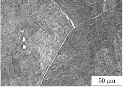 按照 GB/T5168—2008 《α-β钛合金高低倍组 织检验 方 法》,用 20% (体 积 分 数,下 同)硝 酸 + 12%氢氟酸 水 溶 液 对 锻 件 的 低 倍 试 样 进 行 侵 蚀,然后观察试样的显微组织形貌,结果如图1所示。 由图1可知,试样有明显的清晰晶缺陷,原始β晶 界上存在连 续 且 平 直 的 晶 界 α相,其 形 成 原 因 是 该批原材料β相变点测试值偏高,锻造加热炉局部 超温,导致了 TC1钛合金锻造温度过高,从而产生 了清晰晶。