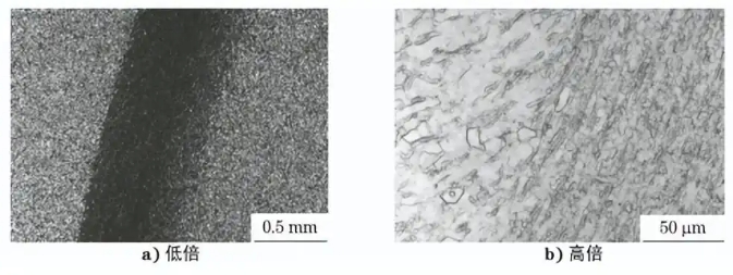 从 TC2低压进气导向叶片截取试样,沿叶片横 截面制样,然后对其进行金相检验,结果如图6所 示。由图6可知,缺陷处的组织与正常区域的组织 存在明显差异,缺陷处的组织深度为0.3mm,为粗 大的α晶粒组成的贫β相区。