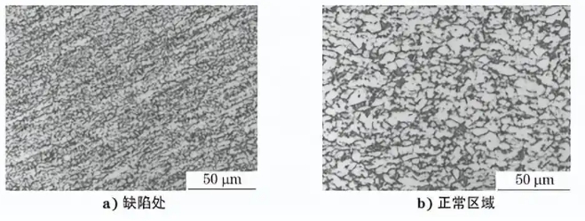 采用电子探针对 TC6锻造叶片暗条缺陷处和 周围正常区域进行成分分析,发现缺陷处钼元素质 量分数为4.12%,周围正常区域钼元素质量分数为 2.78%,缺陷处钼元素质量分数明显高于周围正常 区域。当β相稳定元素钒、钼等发生偏析后,降低了 偏析区域的相变温度,合金在加热时易优先发生 α 相向β相转变,产生暗条缺陷,即所谓的β斑。这种 缺陷的形成同样与原材料冶炼过程有关,可以采用 改进原材料冶炼工艺的方法来避免产生这种偏析 缺陷。