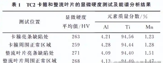 分别对 TC2卡箍和整流叶片进行显微硬度测 试和能谱分析,结果如表1所示,可见 TC2卡箍和 整流叶片亮条缺陷处与周围正常区域的显微硬度测 试结果和能谱分析结果没有明显差异,因此可以判 定 TC2卡箍和整流叶片的亮条缺陷均为锻造过程 中产生的应变线。