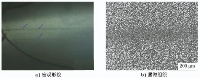 分别对 TC2低压进气导向叶片亮条缺陷处和 周围正常区域进行显微硬度测试,结果显示缺陷处 显 微 硬 度 为 245 HV,正 常 区 域 显 微 硬 度 为 274HV,缺陷处显微硬度略低于周围正常区域。
