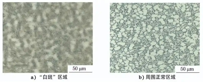 某批次 TC6叶片在抛光后发现“白斑”形貌(见 图10)。对“白斑”区域和周围正常区域进行金相检 验,结果如图11所示。由图11可知,“白斑”区域和 周围正常区域均为等轴组织。