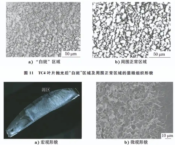 对抛光后的 TC6叶片进行显微硬度测试,发现 “白斑”区域的显微硬度为313 HV,周围正常区域 的显微硬度为347HV,“白斑”区域的显微硬度低 于周围正常区域。钛合金导热性差,故钛合金叶片 在抛光时,如果操作不当,很容易造成零件表面产生 的热量不能及时传导,使零件小范围内温度升高而 形成抛光烧伤,较轻微的仅有表面烧伤,严重时会形 成穿透性烧伤。