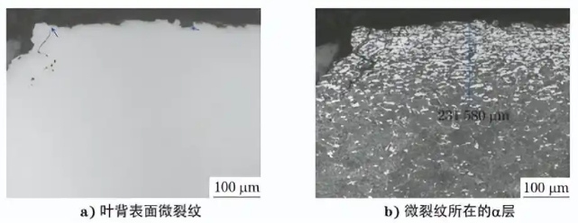 从叶片断口截面处取样进行金相检验,可见叶背 表面有多处微裂纹,裂纹内部未见氧化特征[见图 13a)],叶背近表面可见α层,微裂纹均在α层之内[见 图13b)]。叶片在装夹过程中夹具与叶片的接触点容 易产生应力集中,又因α层具有硬而脆的特性,故在应 力作用下容易萌生微裂纹,最终导致叶片断裂。