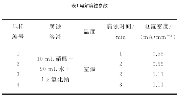 按照图1所示的电解腐蚀装置进行试验装置的布置,配置合适的腐蚀溶液,选用合适的输出电流,按照规定的时间进行电解腐蚀。