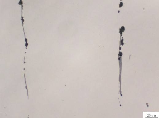 可按照GB/T 10561-2005[5]《钢中非金属夹杂物含量的测定方法》进行取样,经研磨、抛光后观察整个抛光面的情况,取最严重视场进行夹杂物评级。在标准GB/T 10561-2005中介绍了五类夹杂物,A类(硫化物),B类(氧化铝),C类(硅酸盐),D类(球状氧化物),DS类(单颗粒球状类)。