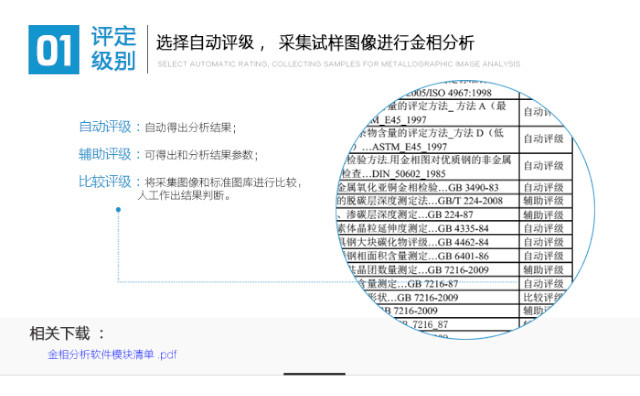 专用金相分析评级软件,以国家检验标准为依据,开发了百余种软件功能模块,用户可根据需要,选择检验项目,在本软件的帮助下,完成检验工作。